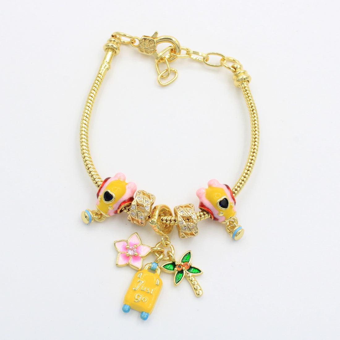 CARACTERÍSTICAS: Pulsera de tejido estilo pandora, con diseño de maletas. Goldfiled fino de alta calidad...