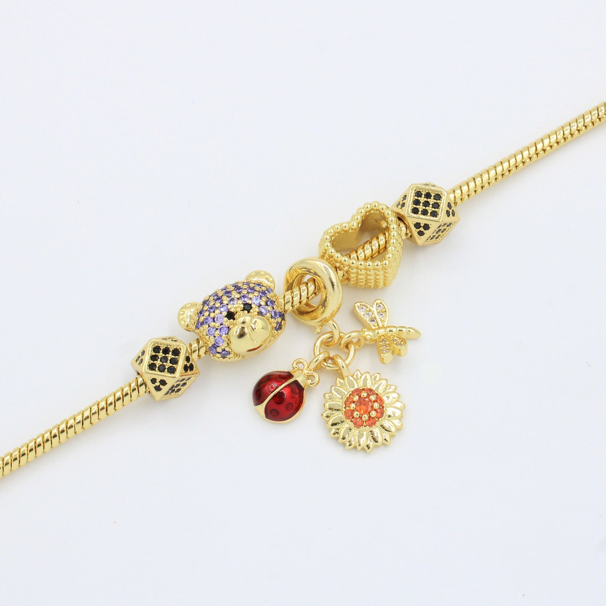 - Pulsera tejido cola de rata con dijes estilo charm y piedras brillantes.