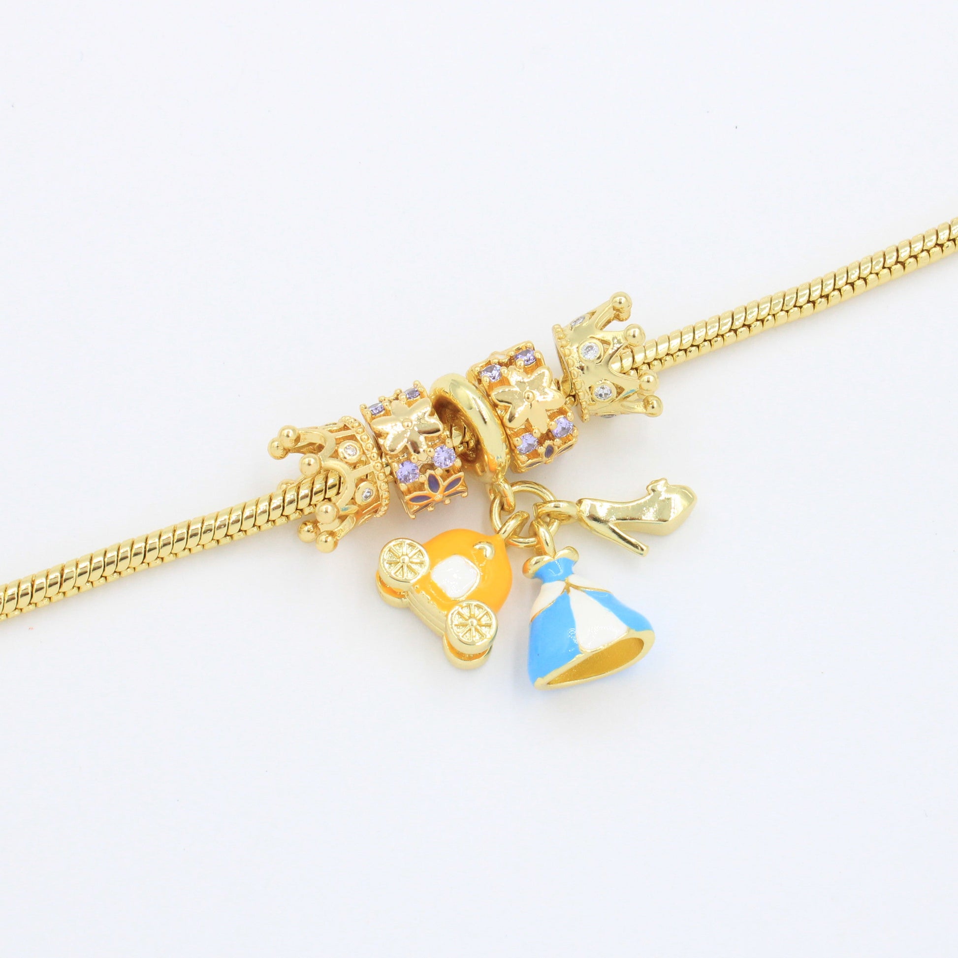 - Pulsera tejido cola de rata con dijes estilo charm y piedras brillantes.