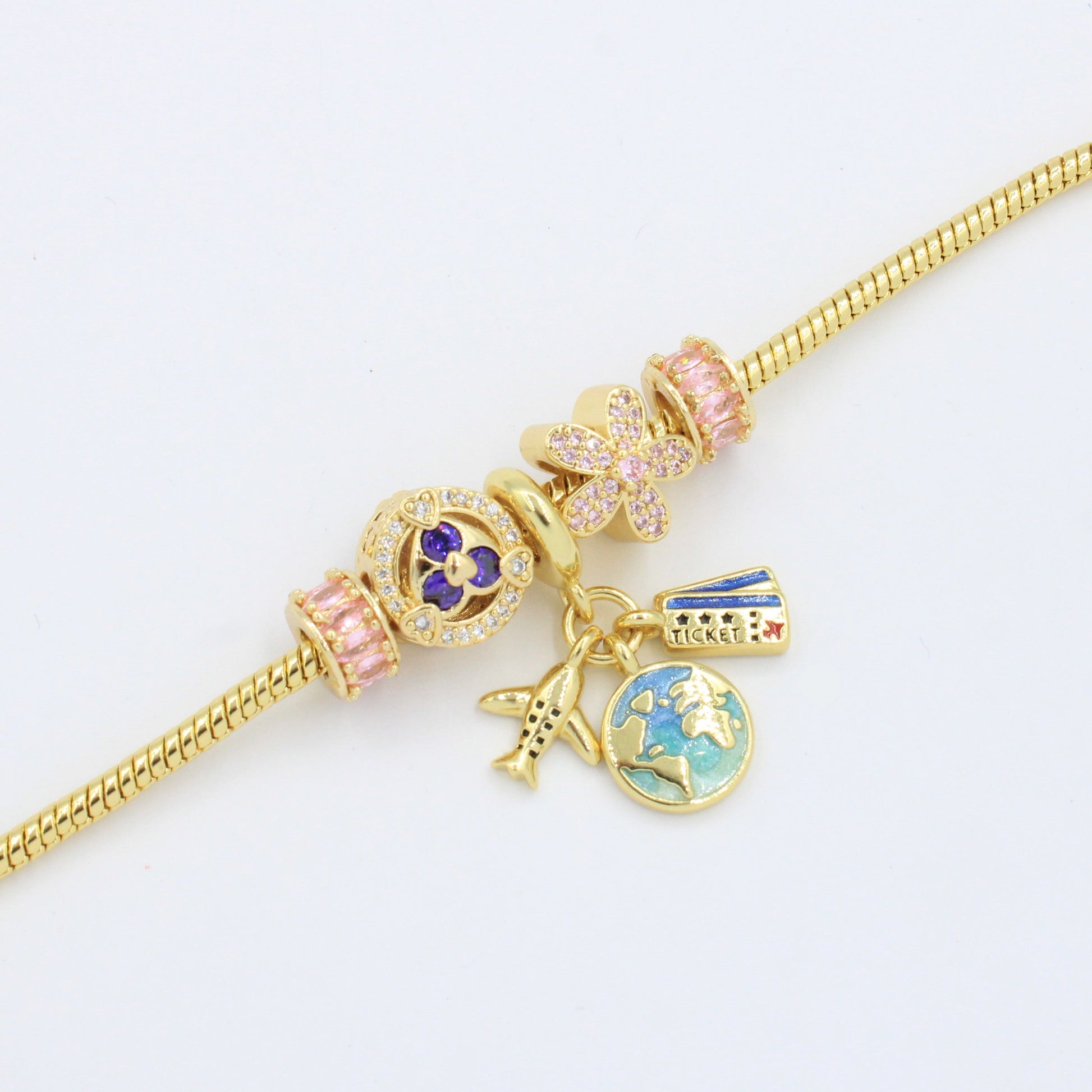 - Pulsera tejido cola de rata con dijes estilo charm y piedras brillantes.