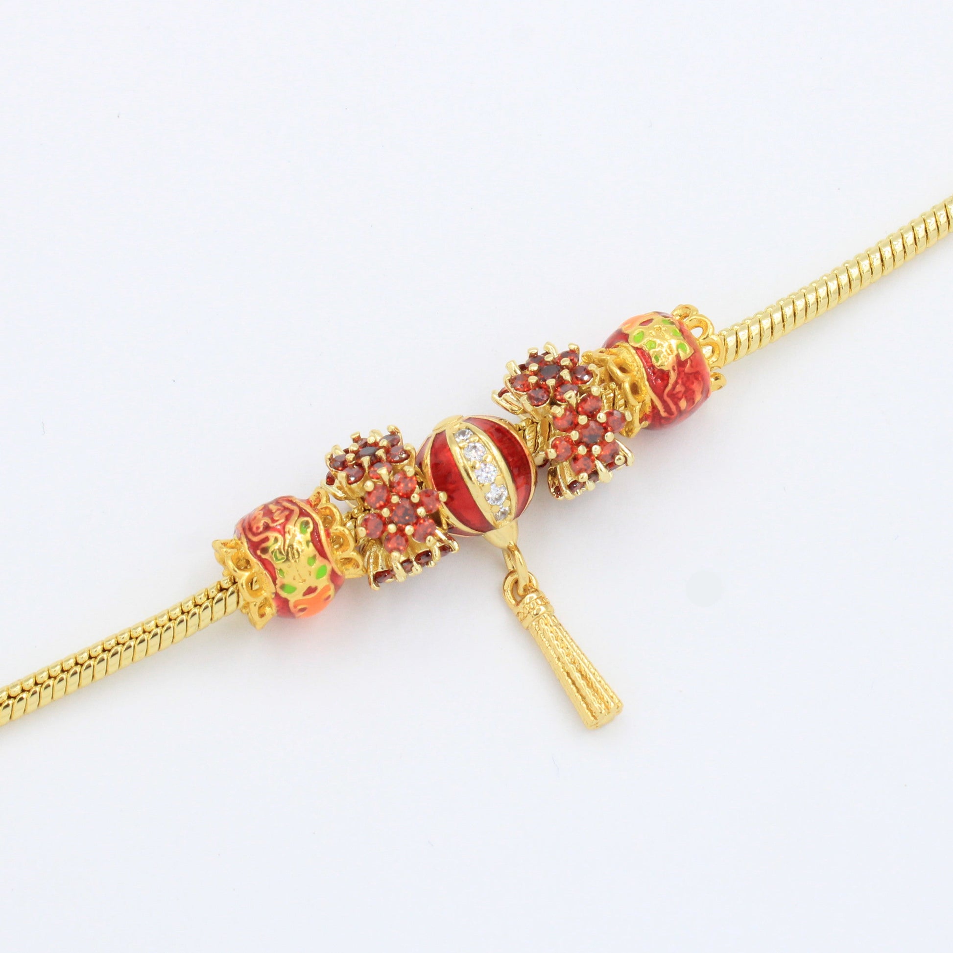 - Pulsera tejido cola de rata con dijes estilo charm y piedras brillantes.