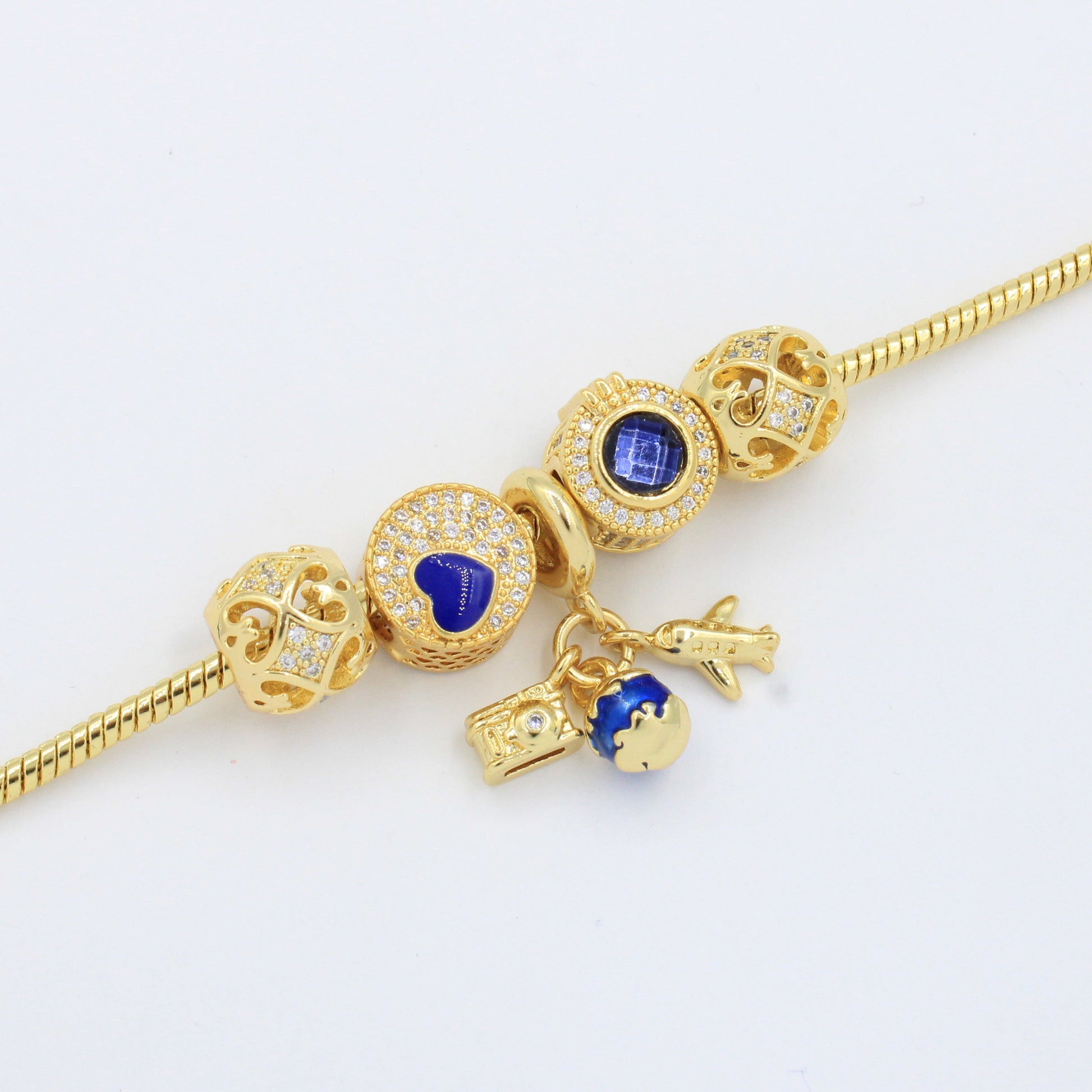 - Pulsera tejido cola de rata con dijes estilo charm y piedras brillantes.